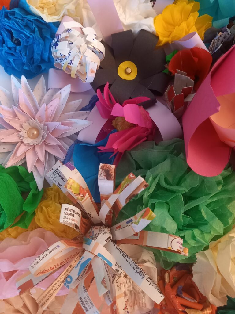 Ensuite, place à la création de leur œuvre faite en binômes ; Guillaume a préparé tout le matériel. Mes élèves choisissent, créent à quatre mains. Moment magique car tous sont concentrés, précis et enthousiastes. Ce n’est pas facile de tresser du papier et, surtout, de choisir comment le découper ! Le résultat est sous vos yeux : amusant, éclairant, différent, créatif.